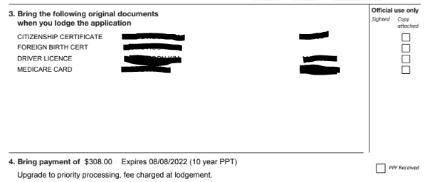 - 2022년 7월 기준 호주 첫 성인 여권 10년짜리의 신청비용은 $308불이다.