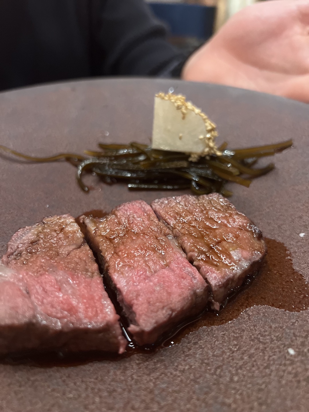 M9이면 거의 최상급의 와규 등급인데 전혀 와규같지 않았으며 그냥 호주 슈퍼에서 파는 rump(엉덩이살) 스테이크를 먹는 느낌의 텍스쳐가 입안에 감도니 많이 실망스러웠다.