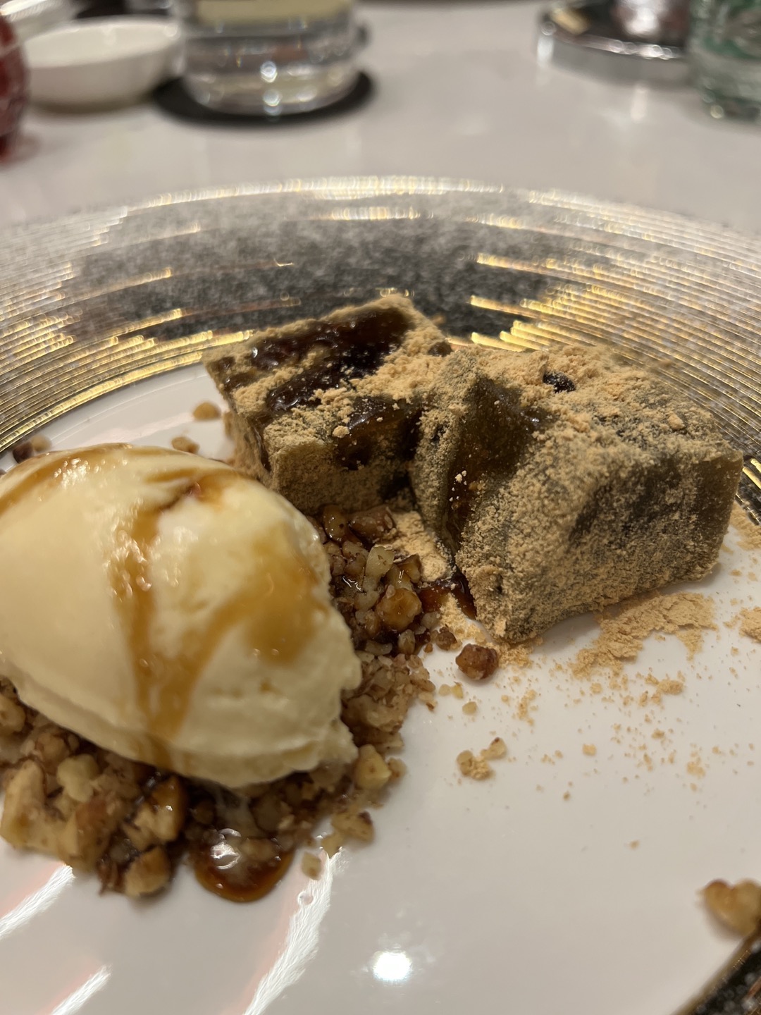 아이스크림 밑에는 캐러멜을 입힌 호두를 부수어서 놓았는데 이걸 찹쌀떡과 함께 먹으니 나쁘지 않은 디저트였다.